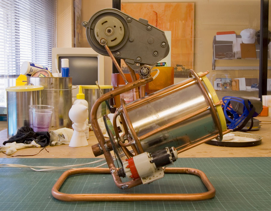 Agradecemos a Jose Luis, una persona allegada al estudio, su inestimable experiencia a la hora de construirla. Mientras nos hablaba de velocidad angular y demás tecnicismos, nosotros pasábamos por otras versiones, más rudimentarias, que nunca llegaron a funcionar bien.